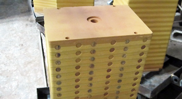 フラン樹脂の入った硬化剤を接着剤として適切な割合で砂に混ぜることで、フラン砂型を作成します。フラン造型は主に複雑で大型の鋳物の製造に適しています。